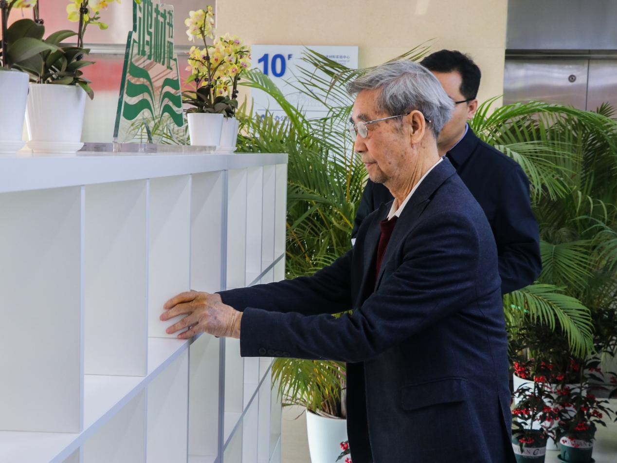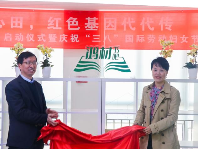 杨静、陈鹏万共同为“鸿材绿色共享书吧”揭幕。陈鹏万表示,共享书吧的标志由材料师生共同设计,标志由一本书籍托举“鸿材”二字,“鸿材”代表着壮志、才能,书籍的正面看去又如一对翅膀,似鸿鹄之翅,寓意“鸿鹄之志”,希望各位师生能从书中汲取力量,“博观而约取,厚积而薄发”。