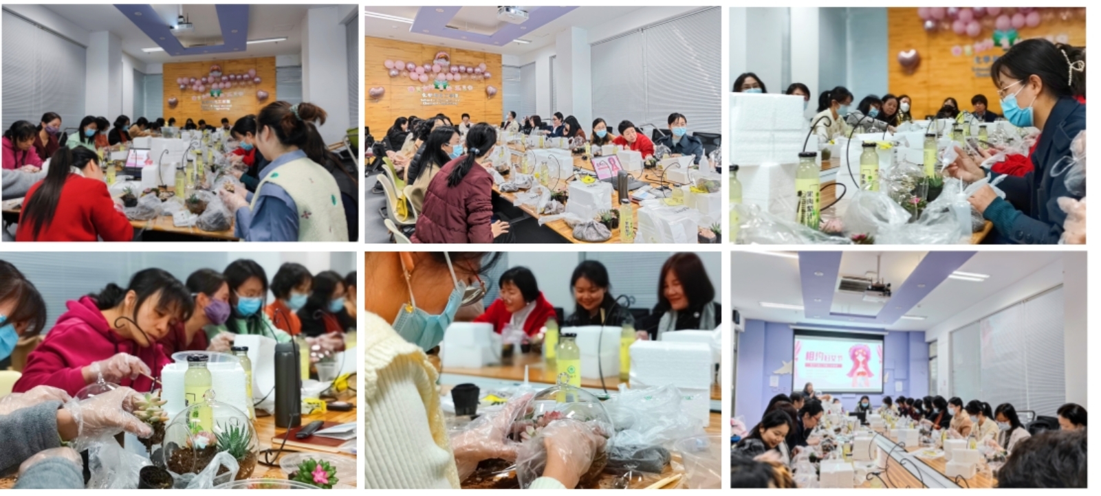 活动当天,近30位学院教职工坐满了整个活动室。大家先对盆景理论知识进行了学习,包括盆景植物的特点,多肉植物的基本分类,盆景植物的养护与管理等,在短暂的学习了解之后便进入了本次活动的实践环节。在实践中,大家不断发挥创造力,整合造型,动手栽种自己的作品。原本普普通通的多肉经老师们的巧手修整后色彩搭配,错落有致。填土、配色、种植......一盆一盆有模有样的多肉盆栽完工。
