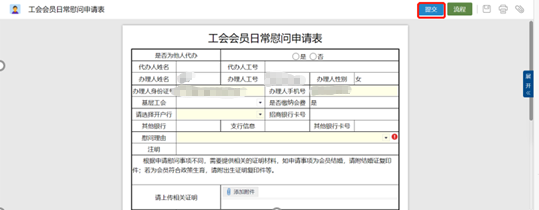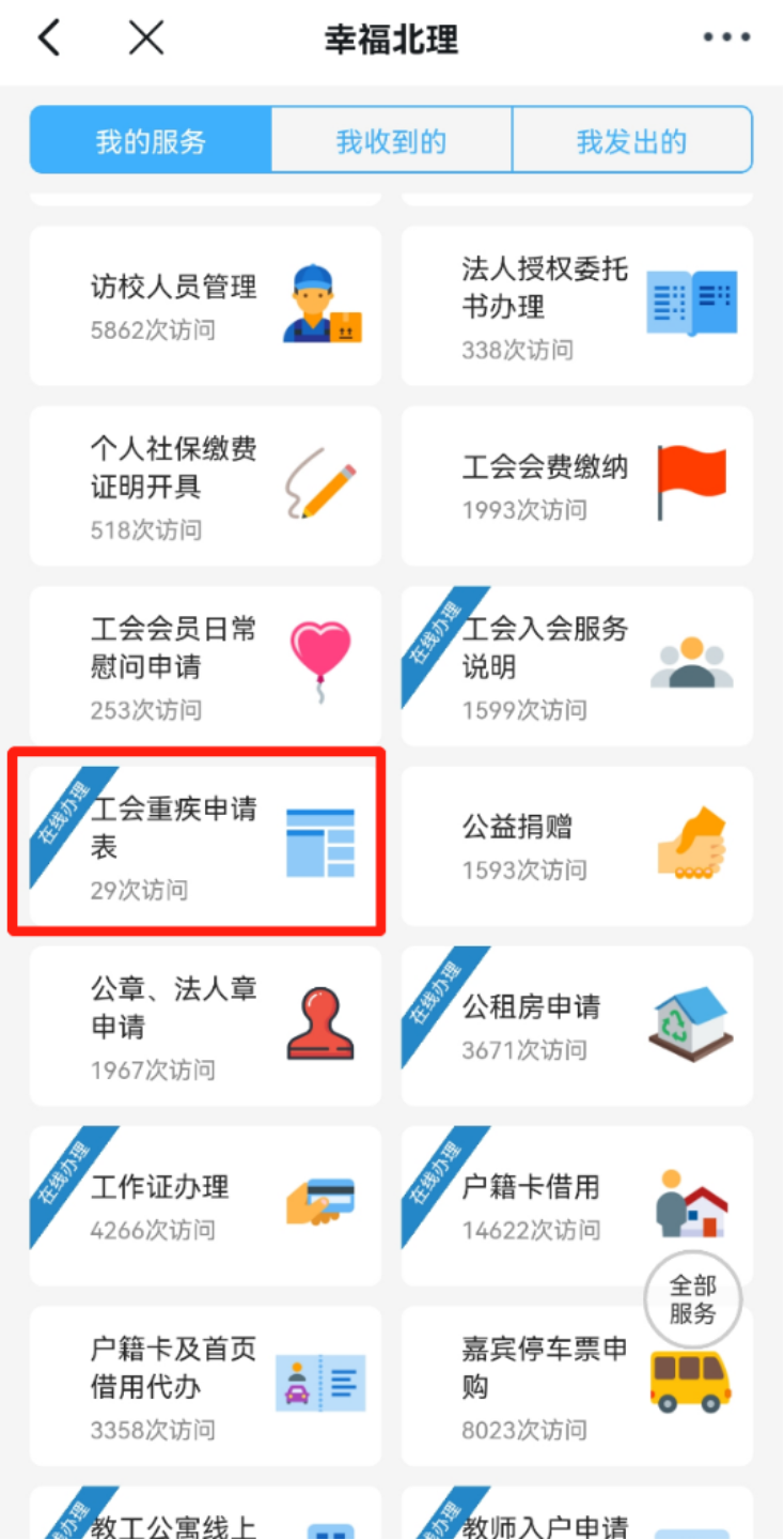 2.在“公共服务”部分选择您要办理的事务类型,我们以“在职职工重大疾病互助保障险申请”为例来示范。点击“会员重疾险申请表”,依次根据要求据实填写。