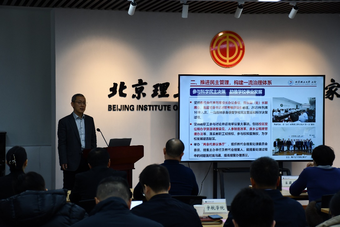 校工会常务副主席高伟涛作2023年工会工作汇报。报告从学习宣传贯彻党的二十大和中国工会十八大精神;推进民主管理,构建一流治理体系;加强思政引领,助力一流人才培养;助推能力提升,建设高素质教师队伍;丰富文体活动,涵育高品质大学文化;竭诚服务职工,汇聚奋进新征程磅礴力量;持续强基固本,加强工会自身能力建设等方面总结了2023年取得的成绩和收获。