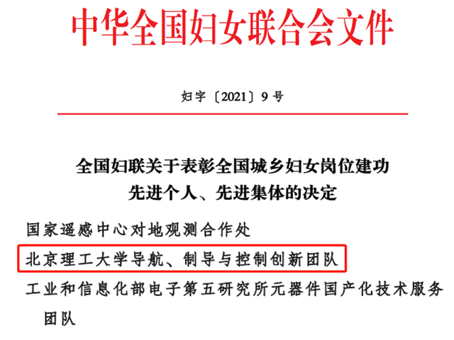 日前,《全国妇联关于表彰全国城乡妇女岗位建功先进个人、先进集体的决定》(妇字〔2021〕9号)公布了全国巾帼文明岗名单、全国巾帼建功标兵名单、全国巾帼建功先进集体名单。betway西汉姆联导航、制导与控制创新团队荣获“全国巾帼文明岗”荣誉称号。