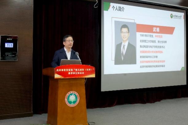 我校推荐的教书育人榜样候选人、北京市青年教学名师、青年长江学者武楠教授,进行现场汇报。学校党委副书记、副校长庞思平代表单位作事迹展示和推荐。