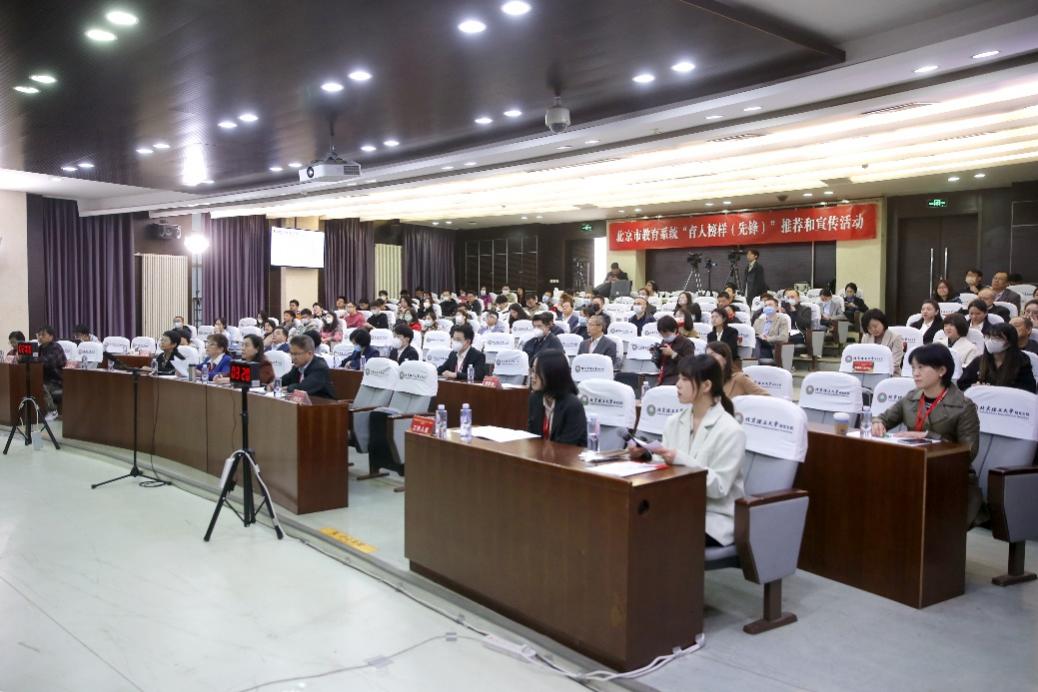 北京市教育系统“育人榜样(先锋)”现场推荐环节包括单位推荐和个人自荐两部分。来自北京48所高校的教书育人榜样候选人、单位代表,进行现场事迹展示和汇报。专家评委组主要由北京市总工会和首都各高校、科研院所的教学专家、名师和学生评委组成。